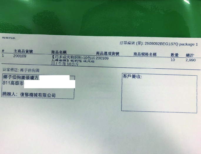 9/22(一)10包狗乾糧 送達 椰子伯狗園張瓊方 DETAIL