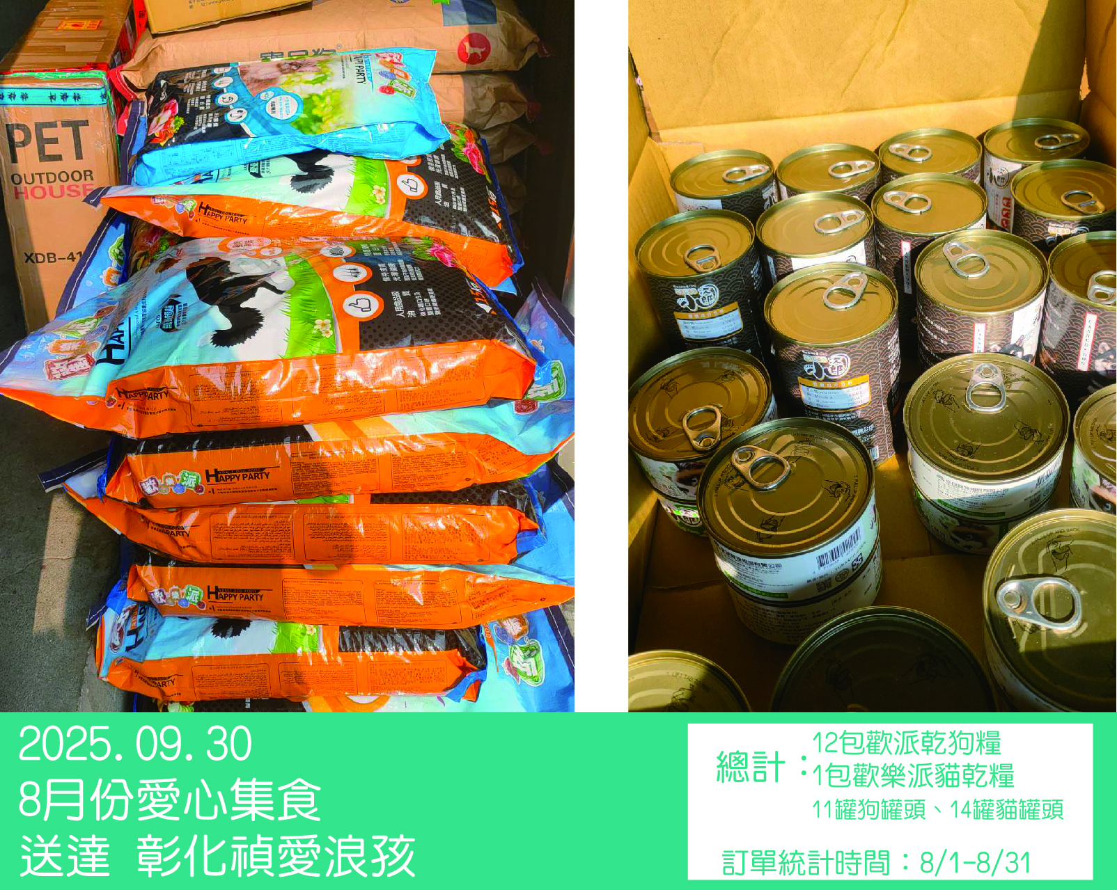 8月份總計12包歡樂派狗乾糧+1包歡樂派貓乾糧+11罐小次郎狗罐頭+14罐小次郎貓罐頭