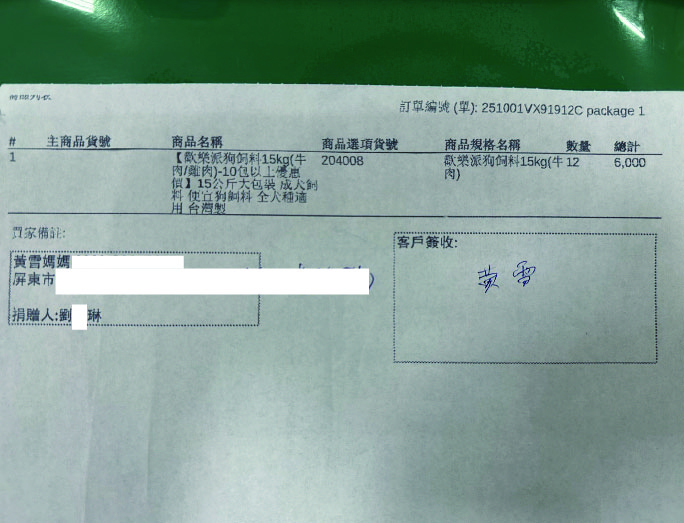11/6(四)12包狗乾糧 送達 黃雪