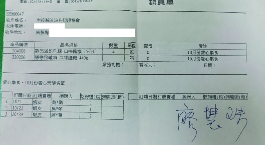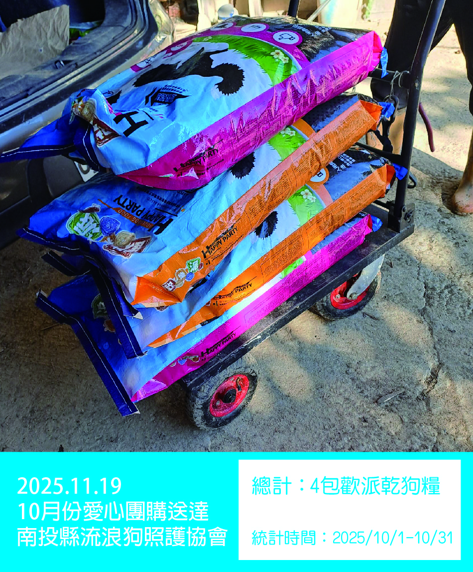 11/19(三)10月份愛心團購送達南投縣流浪狗照護協會