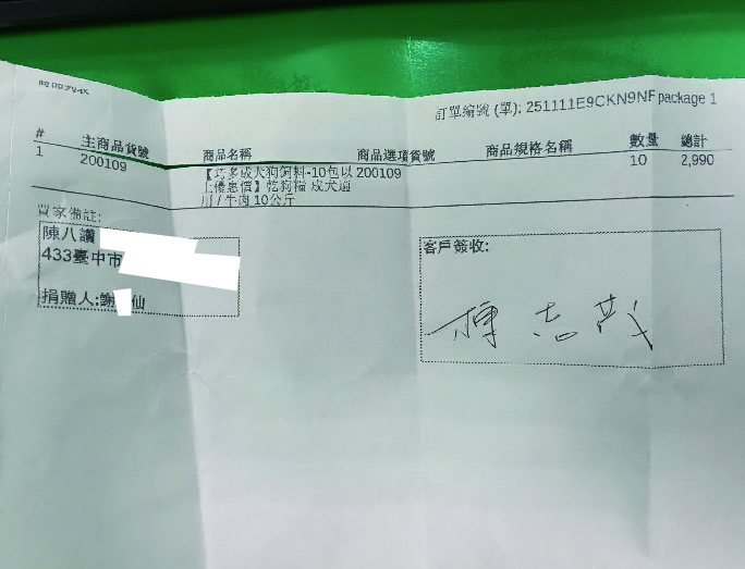 11/20(四)10包狗乾糧 送達 陳八讚 DETAIL