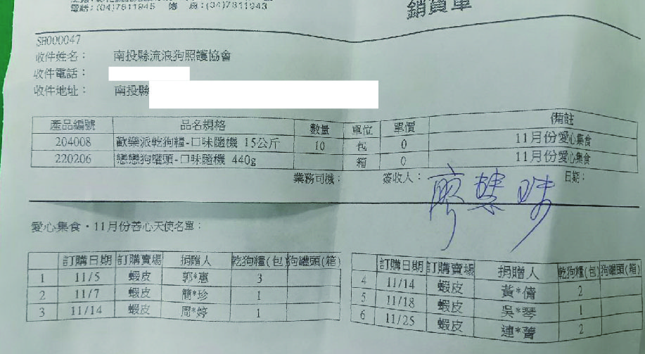 12/5(五)11月份愛心團購送達南投縣流浪狗照護協會