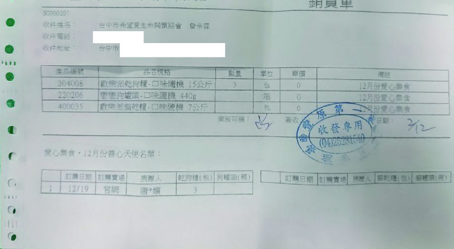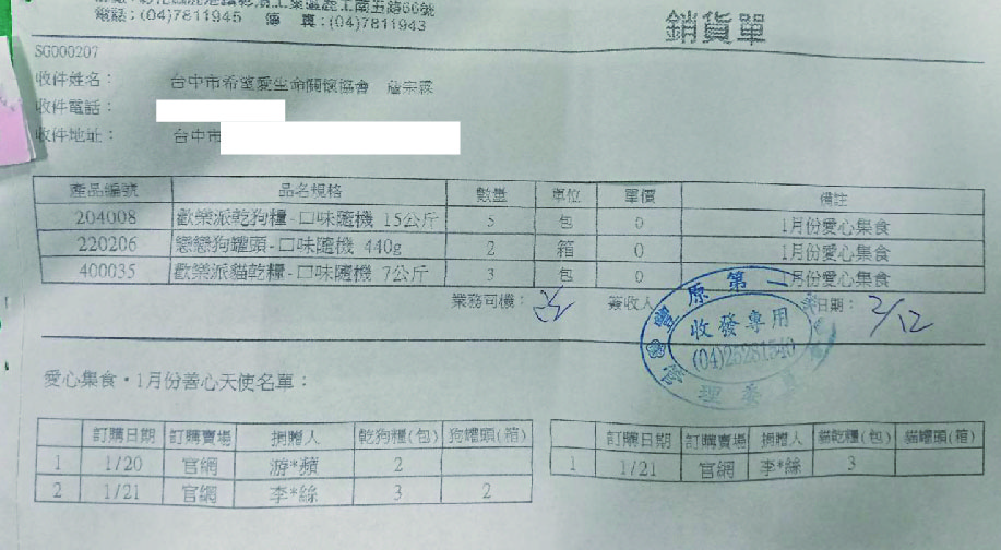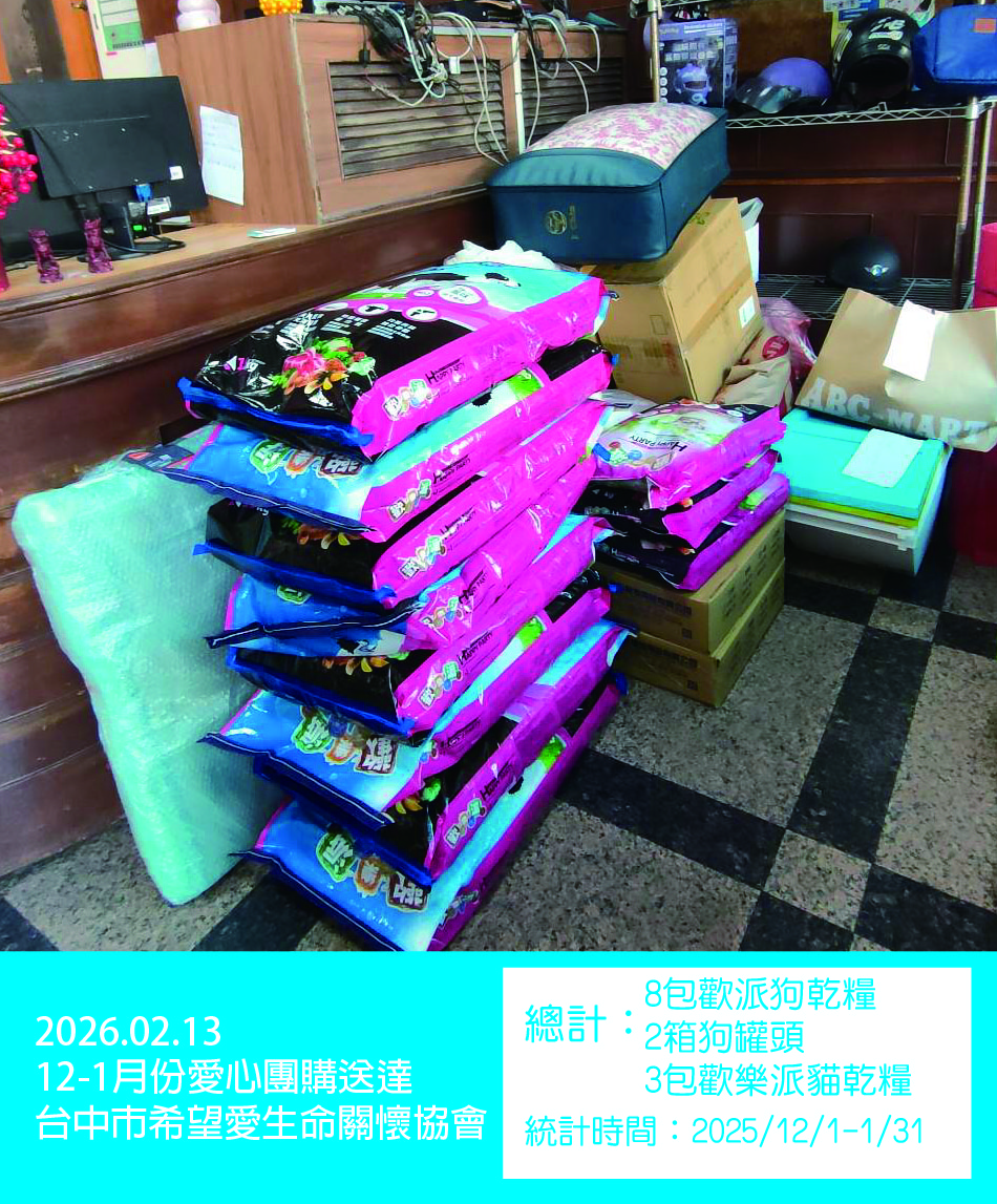 2/13(五)12-1月份愛心團購送達台中市希望愛生命關懷協會