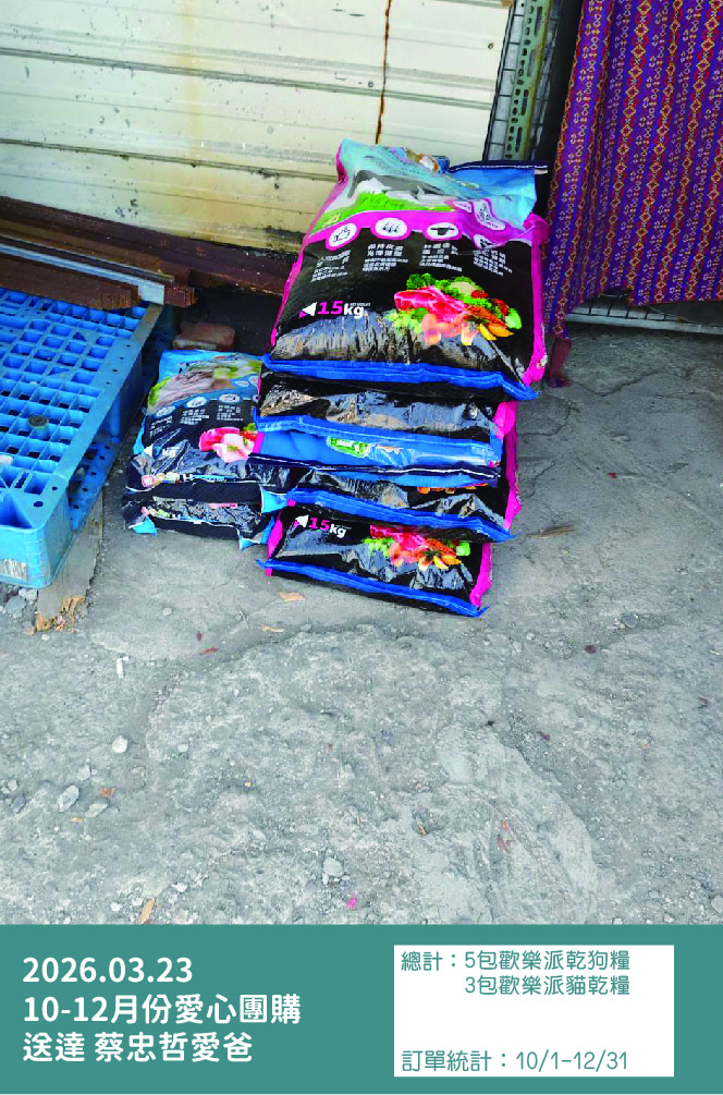 11月份總計3包歡樂派狗乾糧+1包歡樂派貓乾糧