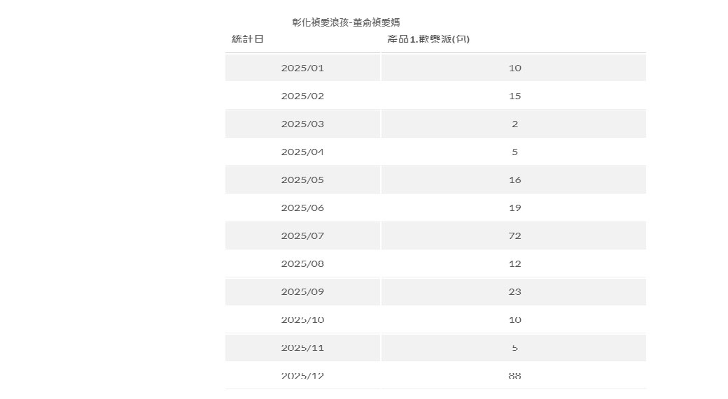 | 統計日 | 產品1.歡樂派(包) | 產品2.罐頭(箱) |